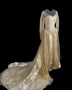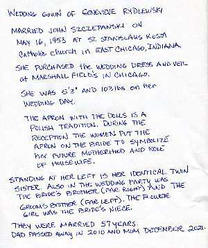 This 1950s bridal ensemble included, among other things, a stunning dress from Marshall Fields, delicate embroidered handkerchief with handmade beaded hairpin lace edge... and, adhering to an old Polish wedding tradition, an apron used to symbolize forthcoming motherhood and wifely duties.