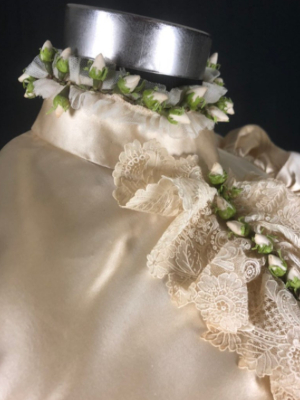A museum deaccession, this item is in remarkably good shape. The fine couture detailing speaks to the highest level of craftsmanship—not to mention expense. The front is lavishly trimmed with a gathering of exquisite handmade Point de Gauze. And notice the small, tender rosebuds circle the neck in a ruffle of soft tulle? They cascade down the center of the lace, and peek out again at the hems of the wrists.