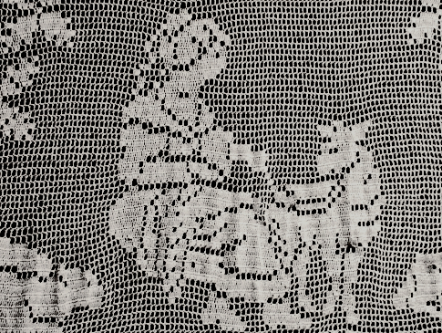On your next visit to Lacis, don't miss Cathy's butterflies and birds, the colossal imposing owl, a lively provincial scene featuring rooster and hens, and the peacock posed in all his glory! In the wool industry-related sequence, we see a dog diligently guarding its flock, a shepherdess in the process of shearing, and presumably the same maiden seated, spinning wool. These lively, cheerful representations must have made their rustic abode truly cozy and homey.
